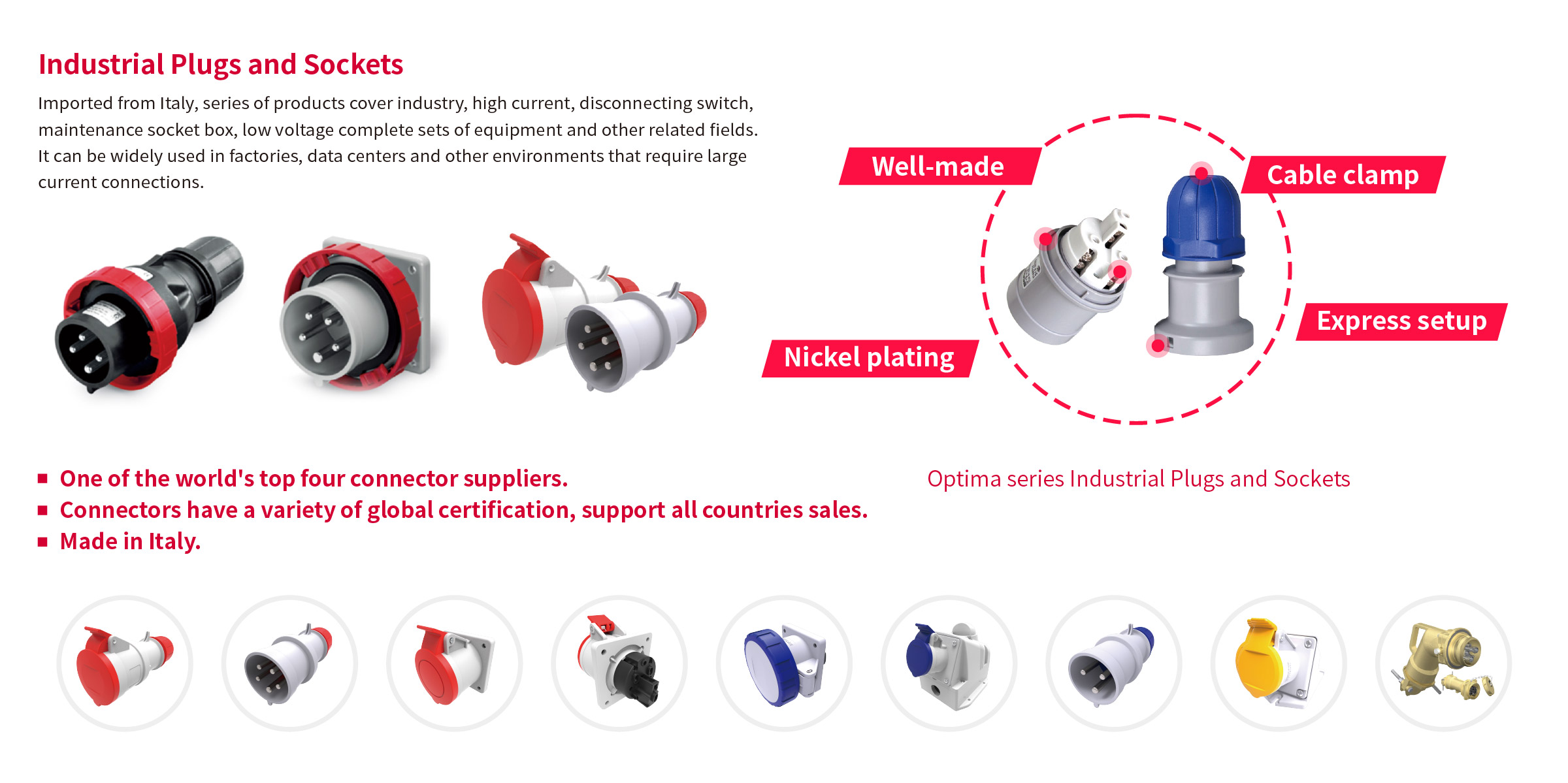 Imported from Italy, series of products cover industry plugs and sockets, high current plugs, disconnecting switch, maintenance socket box and other related fields. It can be widely used in factories, data centers and other environments that require large current connections.