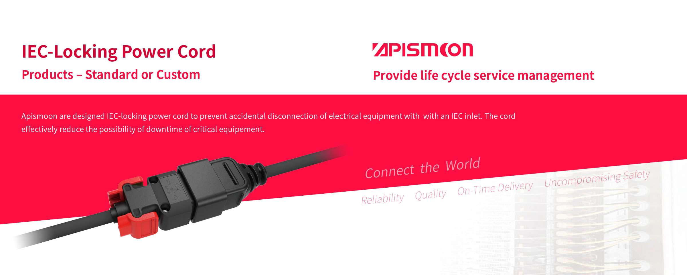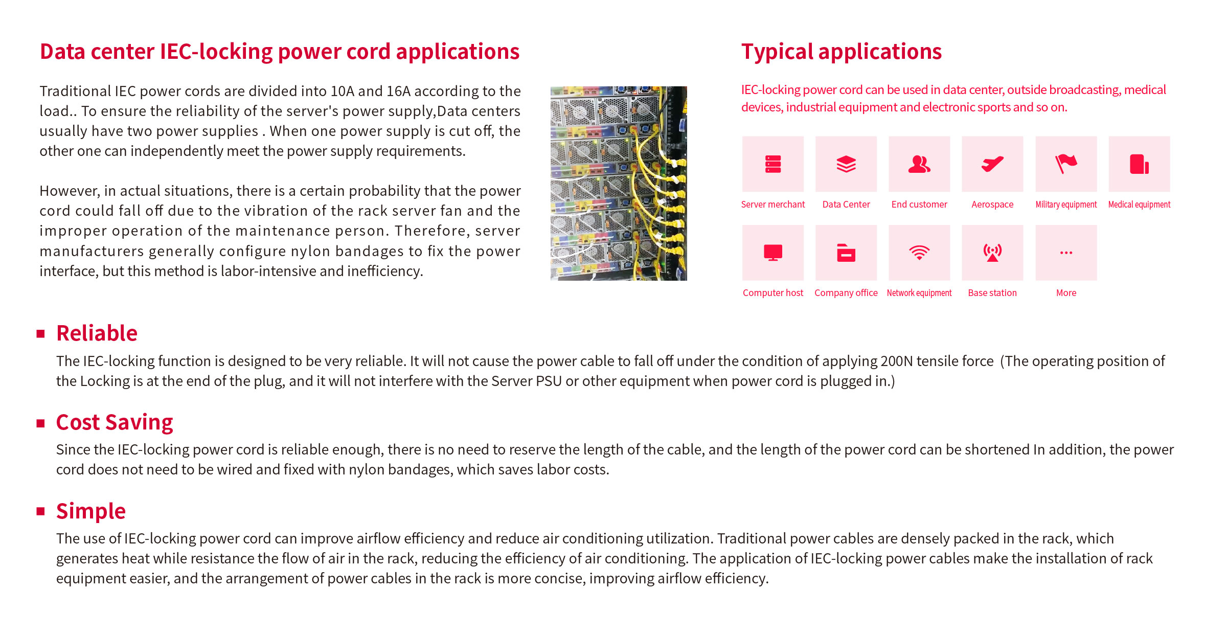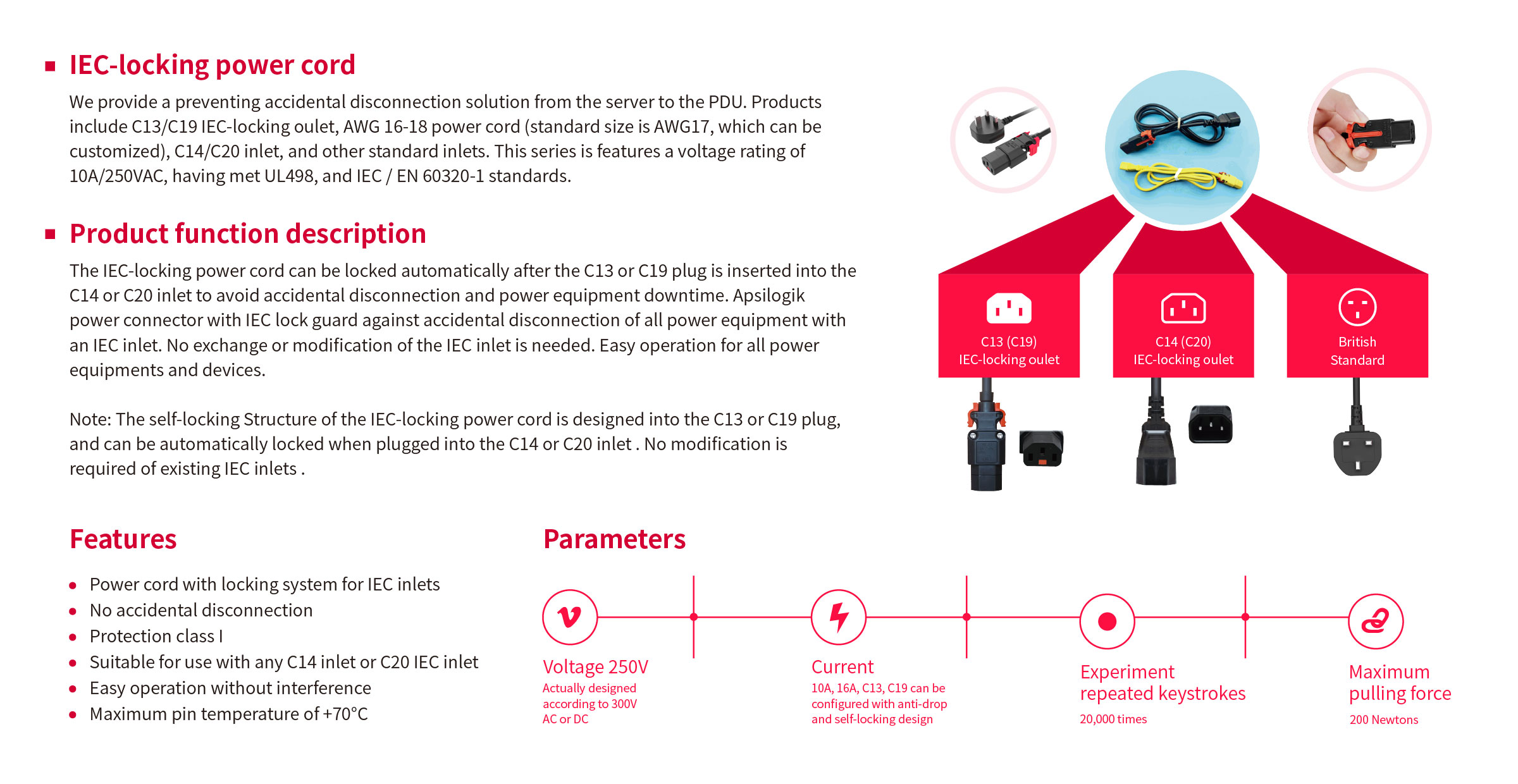 We provide a preventing accidental disconnection solution from the server to the PDU. Products include C13/C19 IEC-locking oulet, AWG 16-18 power cord (standard size is AWG17, which can be customized), C14/C20 inlet, and other standard inlets. This series is features a voltage rating of 10A/250VAC, having met UL498, and IEC / EN 60320-1 standards.