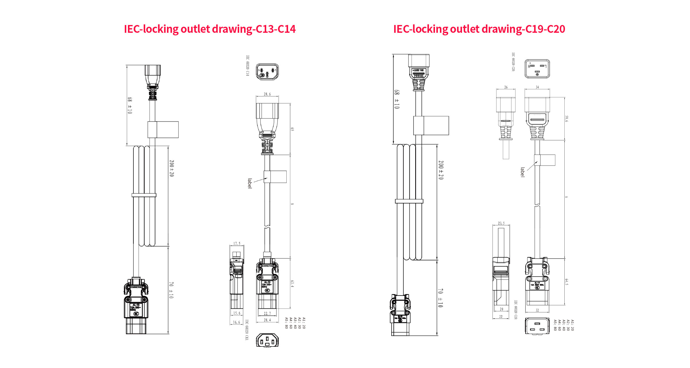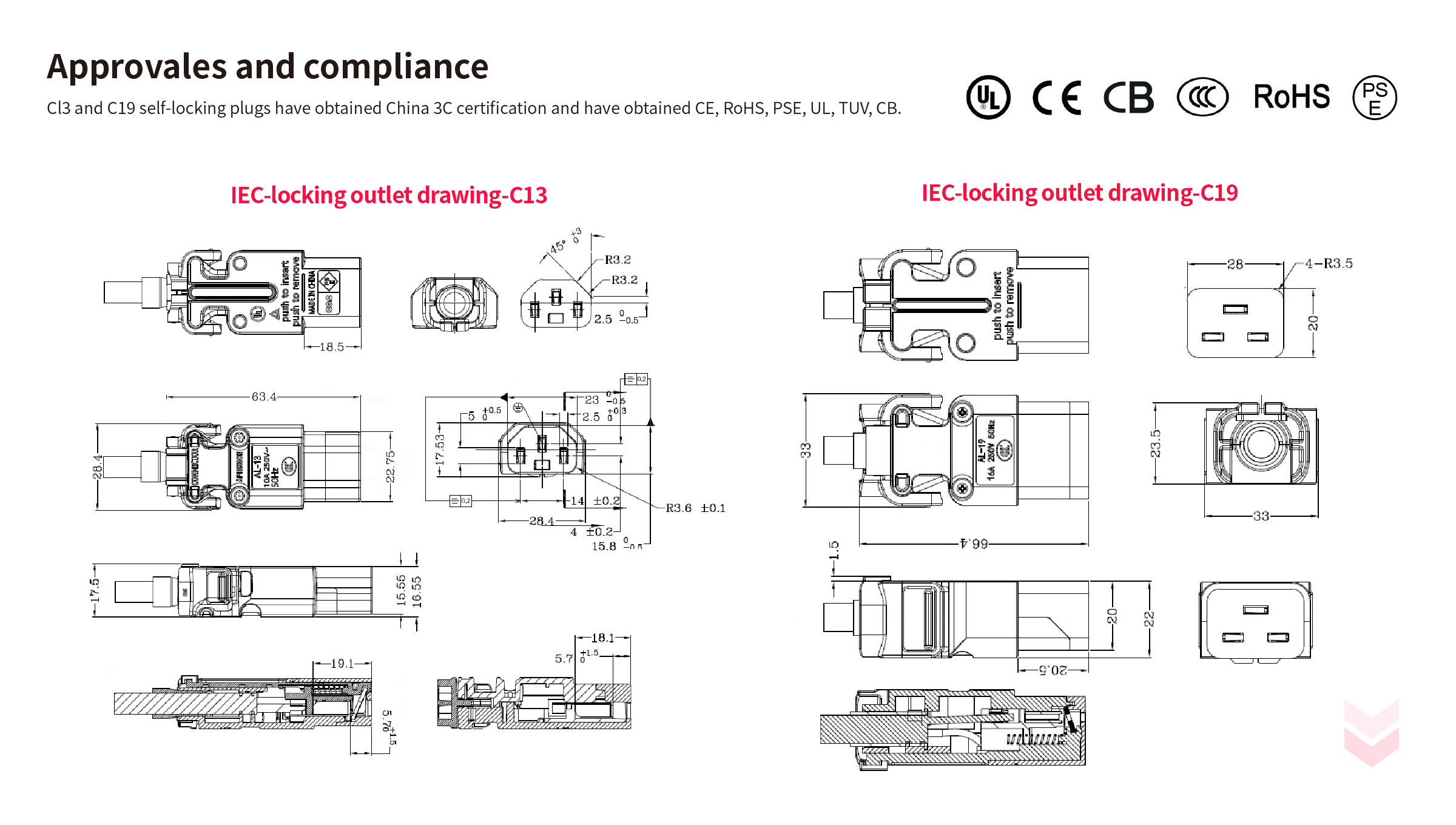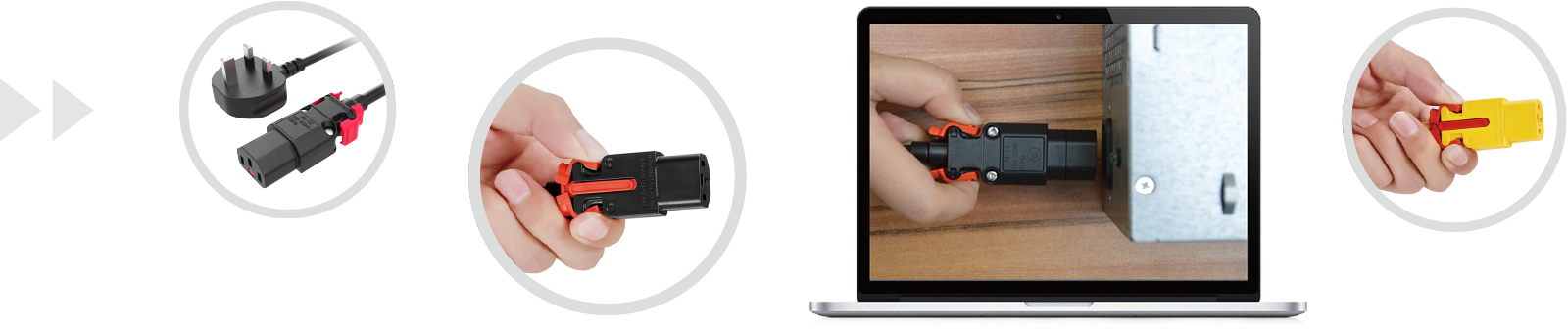 We provide a preventing accidental disconnection solution from the server to the PDU. Products include C13/C19 IEC-locking oulet, AWG 16-18 power cord (standard size is AWG17, which can be customized), C14/C20 inlet, and other standard inlets. This series is features a voltage rating of 10A/250VAC, having met UL498, and IEC / EN 60320-1 standards.